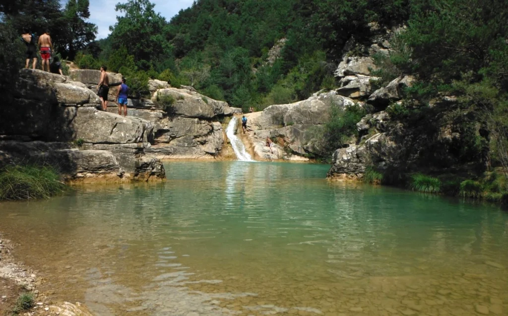 Este es uno de los más populares de toda la comunidad aragonesa. De hecho, el éxito que ha tenido ha hecho que haya restricciones de aforo, así como de saltar desde la zona alta de su cascada. Por este motivo hay que pagar 2€ para poder acceder al salto y a las pozas. Situado en la Sierra de Guara es un lugar perfecto para pasar un día fresquito y de relax.